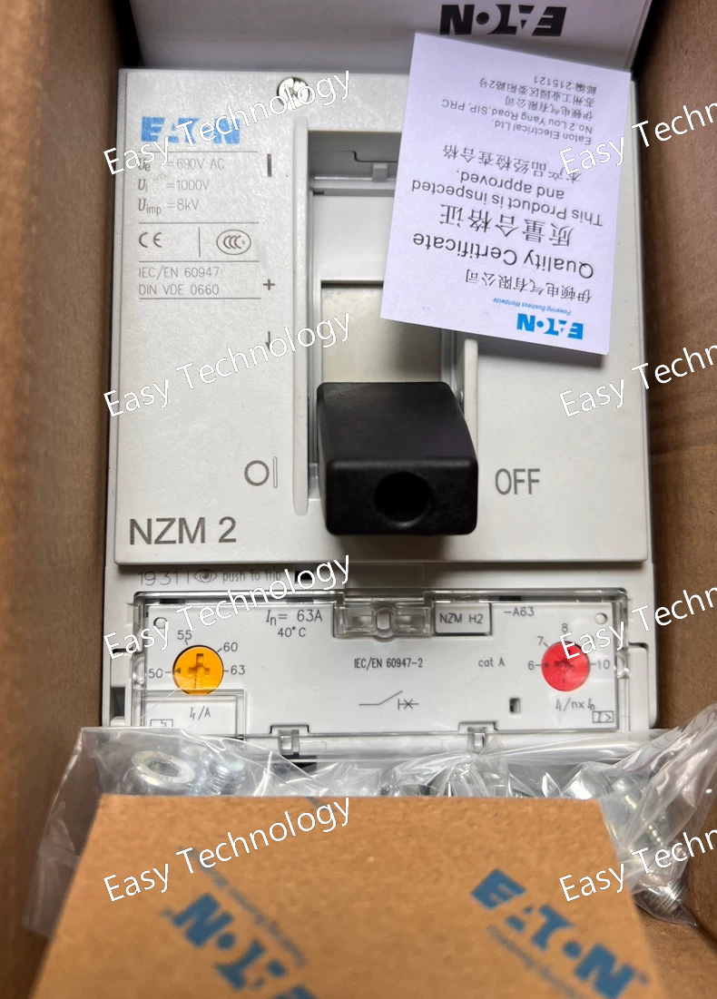 Technical Parameters Category Specification Product Model NZMH2-A63 Product Family Eaton NZM H-series Miniature Circuit Breakers Number of Poles 2 poles Rated Current 63A Rated Voltage 230/400V AC Rated Frequency 50/60 Hz Breaking Capacity 10kA (at 400V AC) Tripping Characteristic C-characteristic (medium trip) Standards Compliance IEC 60898-1, CE Electrical Life 10,000 operations Mechanical Life 20,000 operations Operating Temperature -25°C to +55°C Storage Temperature -40°C to +85°C Protection Degree IP20 (when installed in enclosure) Electrical Characteristics Rated Insulation Voltage: 500V Impulse Withstand Voltage: 6kV Power Loss: <3W per pole Terminal Capacity: 35 mm² max cable size Tripping Characteristics Instantaneous Trip: 5-10 × In (C-characteristic) Thermal Trip: 1.13 × In, t > 1 hour (no trip) Magnetic Trip: 1.45 × In, t < 1 hour (trip) Mechanical Specifications Mounting: DIN rail (35mm) Connection: Screw terminals Torque Requirement: 2.5-3.0 Nm Weight: Approximately 0.4 kg Dimensions: 90 × 35 × 78 mm (H×W×D)