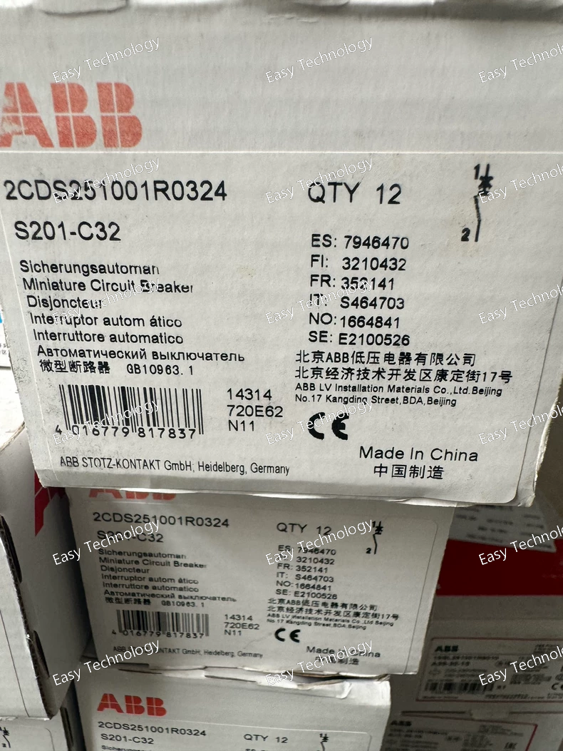 Technical Specifications / Parameters Parameter Specification Manufacturer Order Code 2CDS251001R0324 Catalogue Type S201-B32 Brand / Series ABB S200 Series (System PRO M) Device Type Miniature Circuit Breaker (MCB) Number of Poles 1-Pole (1P) Rated Current (In) 32 A Rated Operational Voltage (Ue) 230/400 V AC Rated Insulation Voltage (Ui) 440 V AC (Industrial standard) Rated Impulse Withstand Voltage (Uimp) 6 kV Tripping Characteristic B Curve (Fast magnetic response. Instantaneous tripping range: 3In to 5In). Rated Breaking Capacity (Icn) 10 kA (at 400V AC, per IEC/EN 60947-2) Utilization Category A (Instantaneous tripping with no intentional short-circuit delay) Standards Compliance IEC/EN 60947-2 (Primary standard, Industrial application). Terminal Type Cage Clamp Terminal Connectable Conductors Solid/Fine-stranded Copper: 1 - 35 mm² Recommended Tightening Torque 3.0 - 3.5 Nm Electrical Endurance ≥ 20,000 cycles (at In) Mechanical Endurance ≥ 20,000 cycles Ambient Temperature Range -25°C to +60°C (for calibration, derating above +40°C) Mounting Snap-on mounting on 35 mm top-hat DIN Rail (EN 60715) Module Width 18 mm (1 Pole, 1 Module) Primary Functions Overload Protection, Fast Short-Circuit Protection Protection Features Trip-free mechanism, clear "ON"/"OFF" visual indication. Accessory Compatibility Compatible with the full range of S200 Series System PRO M accessories: auxiliary contacts (OF, SD), alarm contacts (OF), shunt trips, undervoltage releases, etc. Common Approvals CE, UL 1077 (as a Supplementary Protector), CCC, etc.