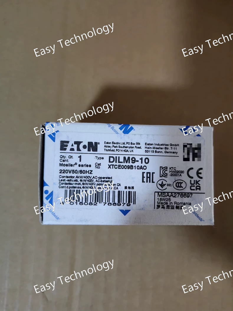 Technical Parameters Parameter Category Description / Value Brand & Series Eaton, DILM Series Model Number DILM9-10 Rated Operational Current (Ie) 9 A at AC-3, 400V Thermal Current (Ith) 9 A Poles (Main Circuit) 3 (Normally Open) Auxiliary Contacts 1 NO (Normally Open) + 1 NC (Normally Closed) - Convertible Rated Operational Voltage (Ue) Up to 690V AC Control Coil Voltage Available in multiple standard AC voltages (e.g., 24V, 110V, 230V, 400V AC). The specific voltage must be specified when ordering. Utilization Categories AC-3: Squirrel cage motors: Starting, switching off during running AC-1: Non-inductive or slightly inductive loads Motor Rating (at 400V AC) 4 kW / 5.5 HP Mechanical Life ~ 15 million operations Electrical Life (AC-3) ~ 1.5 million operations Mounting Standard 35mm DIN Rail (EN 60715) or screw mounting Standards Compliance IEC/EN 60947-4-1, UL 508, CSA C22.2 No. 14 Terminal Type Cage Clamp / Screw Clamp