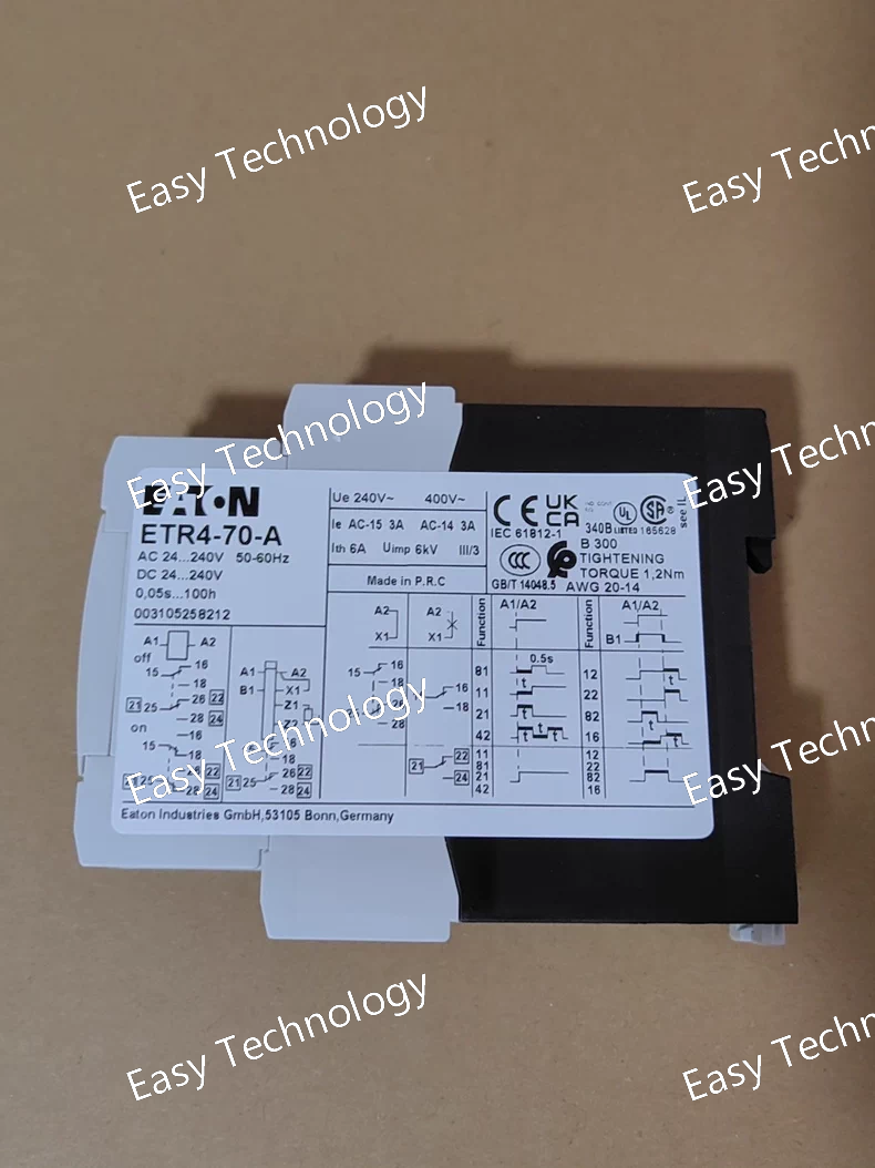 Technical Parameters Parameter Category Description / Value Brand & Series Eaton, ETR4 Series Model Number ETR4-70-A Poles 3-Pole Trip Class Class 10 Current Setting Range 53 - 70 A Rated Operational Voltage (Ue) 690V AC Rated Insulation Voltage (Ui) 1000V AC Ambient Temperature Range -25°C to +60°C (Derating may apply above +50°C) Standards Compliance IEC/EN 60947-4-1, UL 508, CSA C22.2 No. 14 Mounting Snap-on mounting to compatible Eaton DIL contactors Auxiliary Contacts 1 NO (95-96) + 1 NC (97-98) - Convertible Reset Mode Manual reset (Automatic reset optional)