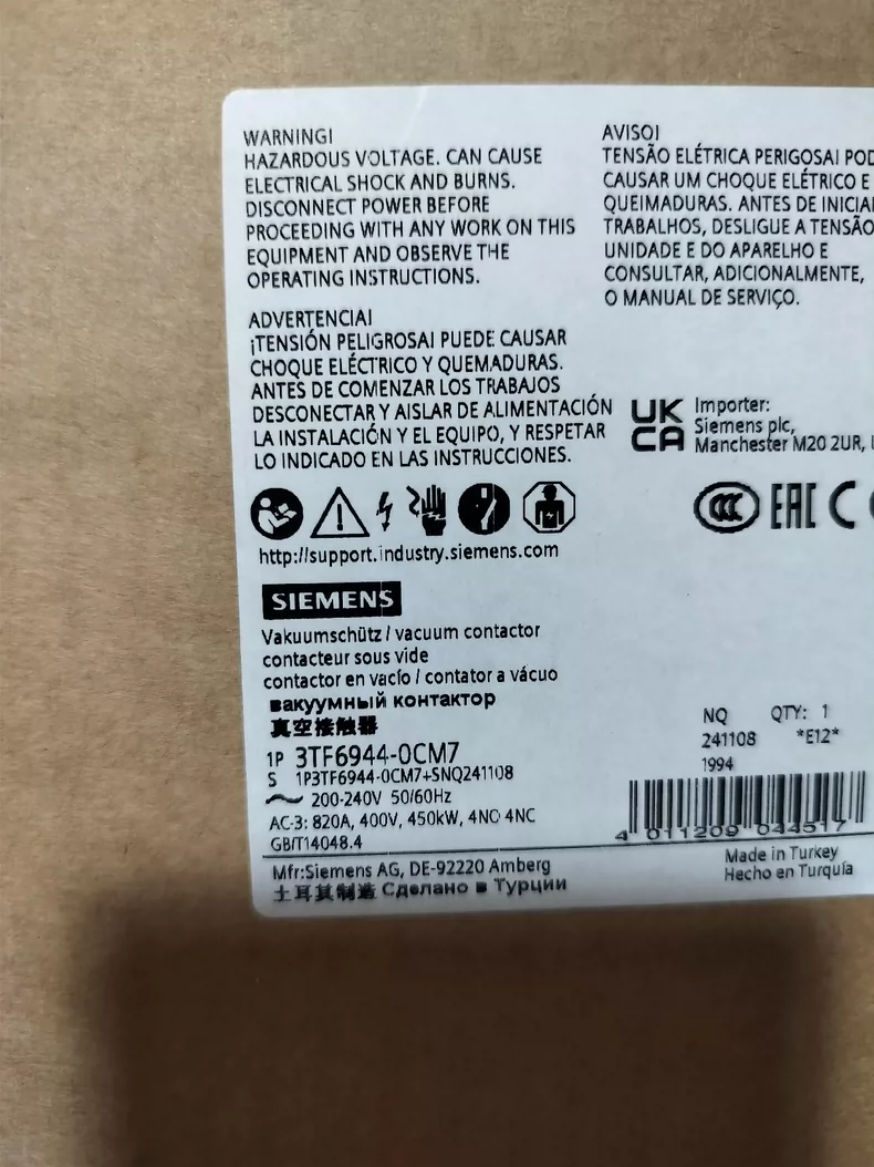 The 1P 3TF6944-0CM7 is a SIRIUS 3TF69 three-pole power contactor from Siemens, designed for heavy-duty motor control and power switching applications in industrial environments.