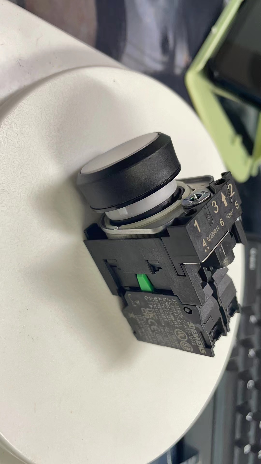 The 3SU1102-0AB60-1BA0 is a compact pushbutton switch from Siemens' 3SU11 series, designed for industrial control panels. Featuring a 22 mm diameter, it includes a momentary-action NO (normally open) contact with a black mushroom-head actuator, ideal for emergency stop (e-stop) applications.