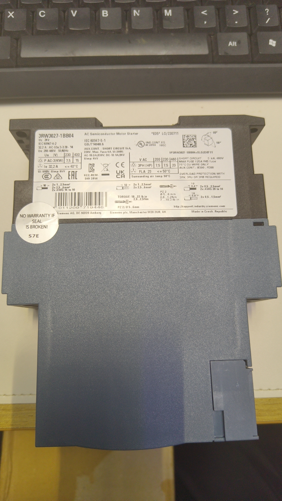 The 3RW3027-1BB04 is a 3-phase AC soft starter from Siemens, designed for motors up to 15 kW at 400 V AC or 18.5 kW at 500 V AC. It supports voltage ranges of 380–480 V (for 15 kW) and 500–690 V (for 18.5 kW), with current ratings of 32 A (400 V) and 25 A (690 V).