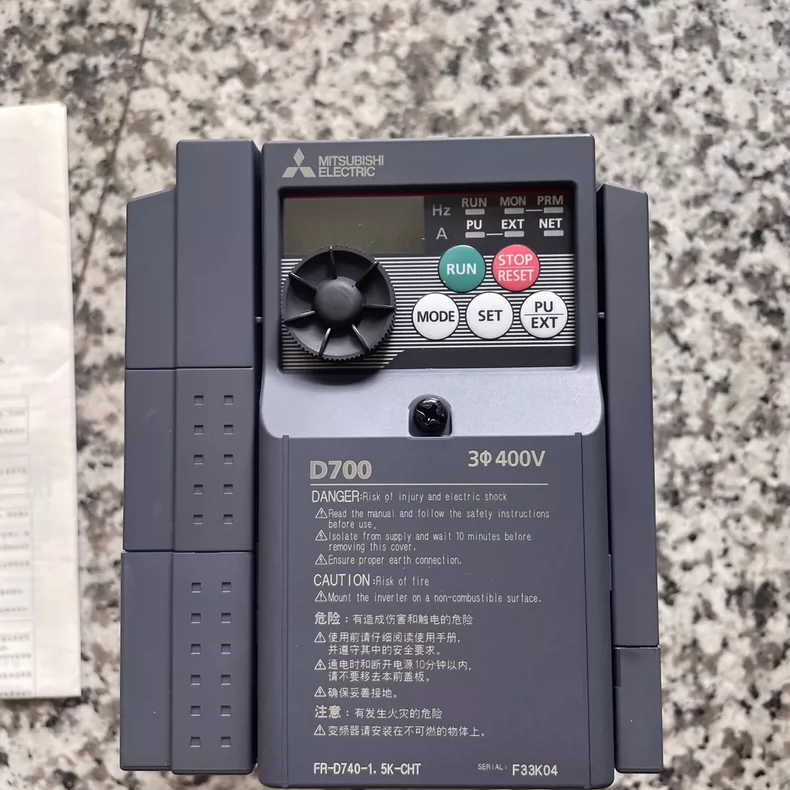 The FR-D740-1.5K-CHT is a compact, high-performance 1.5kW (2HP) variable frequency drive from Mitsubishi Electric's FR-D700 series, designed for precise speed control of 3-phase induction motors. This model features specialized heat dissipation technology (CHT designation) for reliable operation in high-temperature environments.