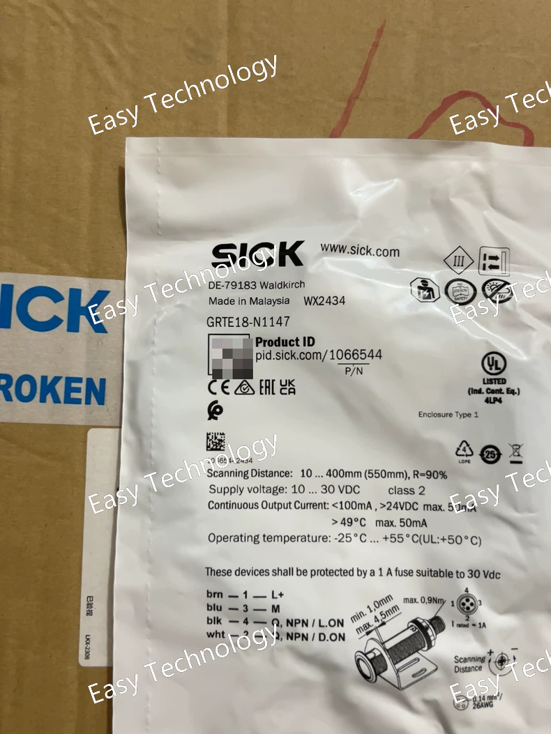 The SICK GRTE18-N1147 is a Type 4 safety light curtain from the GRTE series, designed specifically for point-of-operation safeguarding on machinery. It creates an invisible field of infrared beams between a transmitter and receiver. When any beam is interrupted (e.g., by a person's hand reaching into a dangerous area), the device sends a stop signal to the machine's control system, preventing potential injury.
