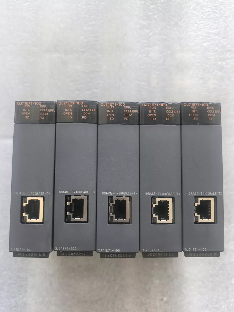 The QJ71E71-100 is a 10/100BASE-TX Ethernet interface module for Mitsubishi's Q Series PLC, designed for industrial network communication and remote monitoring. This module enables seamless integration with factory automation networks using standard Ethernet protocols.