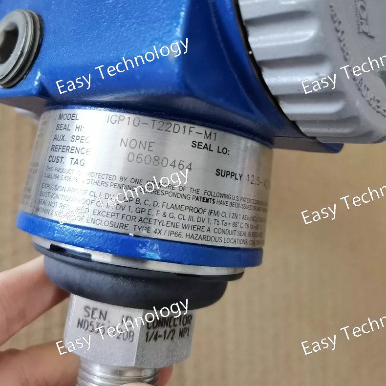 Model Foxboro IGP10-T22D1F-M1 Type Gauge Pressure Transmitter Measurement Range 0-1000 psi (0-69 bar) (typical for "T22" code) Output Signal 4-20 mA DC with HART® Protocol Accuracy ±0.075% of full scale (typical for IGP10 series) Power Supply 12-42 V DC (loop-powered) Process Connection 1/2" NPT Female Wetted Materials Diaphragm: 316L Stainless Steel; Seals: Viton® (FKM) Housing Rating NEMA 4X (IP66) Ambient Temperature -40°C to +85°C (-40°F to +185°F) Process Temperature -40°C to +120°C (-40°F to +248°F) Adjustable Turndown Up to 20:1 Stability ±0.1% of URL per year Protocol HART® Electrical Connection 1/2" NPT Conduit (for "F" code) Calibration Factory calibrated ("M1" suffix) Certifications CE, ATEX, IECEx (depending on variant)