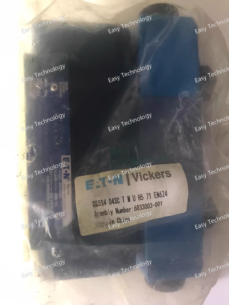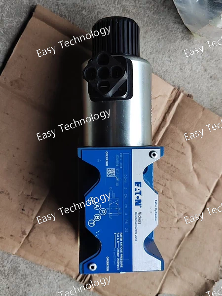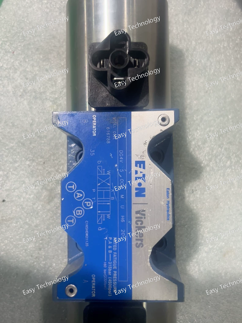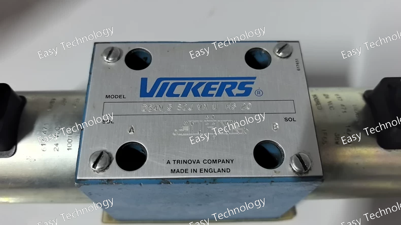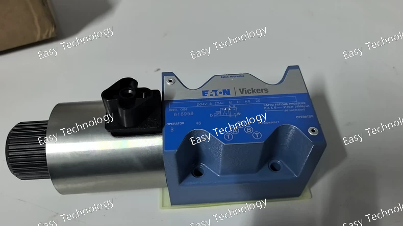 Technical Specifications Brand / Series: Vickers by Eaton — DG4V-5 series (20-series design) Model Code: DG4V-5-2AJ-VMU620 Valve Type: Solenoid-operated directional control valve (4-way / 3-way, depending on port/spool configuration) Mounting / Interface: Subplate / manifold mount, ISO 4401-05 (NFPA D05 / NG10) Actuation: Solenoid operated (dual/ single depending on coil config) Electrical Connection: ISO 4400 (DIN 43650) connector Flow Capacity: up to 32 US gpm (≈ 120 L/min) — depending on spool and system conditions Maximum Operating Pressure (Ports P, A, B): 315 bar (≈ 4500 psi) Tank Port Pressure Rating (T port): typically up to 160–210 bar (depending on coil type / spec) Seal Material (standard): Viton (O-rings / seals compatible with petroleum hydraulic oils) Fluid Compatibility: Petroleum-based hydraulic oils Spool Type: 2AJ (closed-center / all ports blocked in neutral, per spool code) Spool Spring Arrangement: Spring-offset (end-to-end) — spring offsets spool toward one end when solenoids are de-energized Manual Override: Plain (standard override in solenoid end only, if equipped) Valve Mount Type: Subplate / manifold mounted (D05 / NG10) Fluid Cleanliness Requirement: 19/17/14 micron code (recommended filtration) Working (Ambient) Temperature Range: from –20 °C (–4 °F) up to about +40 °C (104 °F) for certain coils (for AC coils; DC-coil variants may permit higher ambient) Valve Body Material: Cast gray-iron (robust industrial construction)