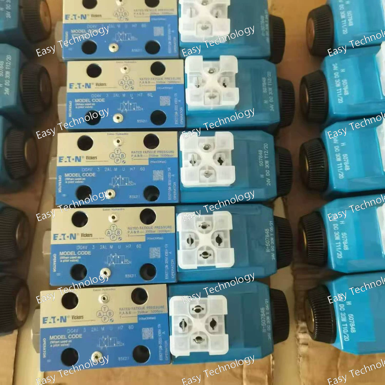 Technical Specifications Brand / Series: Vickers by Eaton, DG4V-3 series (60 Series design) Model Code: DG4V-3-2AL-M-U-H7-60 Actuation Type: Solenoid operated Coil Voltage: 24 V DC Mounting / Interface: Subplate / manifold mount, ISO 4401-03 (D03) interface Valve Type: Directional control valve (3- or 4-way) Flow Rate (max): up to 21.0 GPM (≈ 80.0 L/min) Max Operating Pressure (P, A, B ports): 350 bar (≈ 5000 psi) Max Tank Port Pressure (T port): 210 bar (≈ 3000 psi) Seal Material (standard): Viton (for multi-fluid compatibility) — nitrile (Buna-N) may be an option depending on variant. Electrical Connection: ISO 4400 (DIN 43650) solenoid connector Power Consumption (coil): approx. 30 W Spool Type / Spring Arrangement: Spool “2AL” / Spool 2, Spring-offset (end-to-end) center arrangement Manual Override: Plain (standard) Fluid Compatibility: Petroleum-based hydraulic oils Fluid Cleanliness Recommended: 19/17/14 micron code Operating Temperature Range: –20 °C to +70 °C (–4 °F to +158 °F) Body Material: Gray cast iron Valve Size: D03 (ISO 4401)