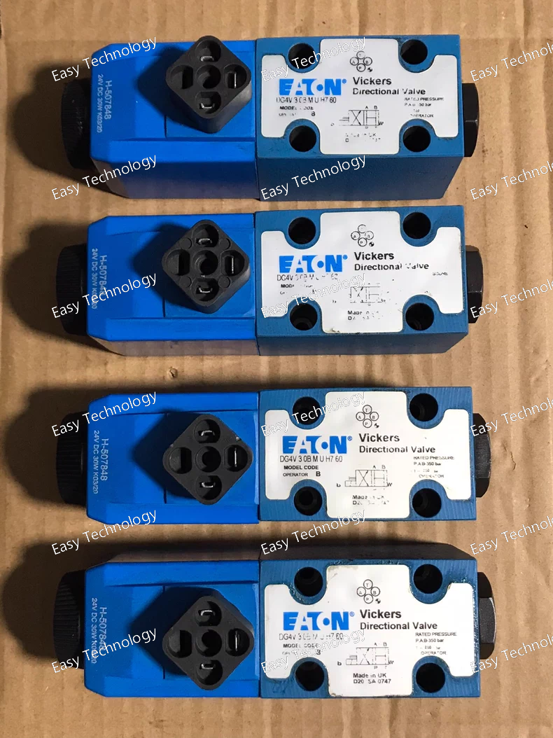 Parameter Description / Value Notes Product Line Eaton DG4V Second Generation Type Proportional Directional Control Valve 4-way, 3-position Porting Size NG03 (CETOP 3 / NFPA D01) Standard subplate interface Maximum Operating Pressure 350 bar (5,075 psi) Maximum Flow Rate Approx. 19 L/min (5 US gpm) *Dependent on spool and pressure drop (e.g., Δp = 10 bar).* Spool Type 0B (O-spool with critical center overlap) Provides a blocked center with minimal leakage at neutral, ideal for holding loads. Center Position M (Closed Center / All Ports Blocked) In the center (neutral) position, all work ports (A, B) and the pressure port (P) are blocked, and the tank port (T) is open. This effectively holds an actuator in place. Solenoid Type Proportional Solenoid Wet armature design Electrical Connector U (DIN 43650 Form A, 4-pin) Standard industrial connector Integrated Electronics H7 On-board amplifier card for open-loop control Input Signal ±10 VDC or 4-20 mA Selectable via internal dip-switches Supply Voltage (to amplifier) 12-30 VDC For the H7 amplifier Coil Voltage Derived from internal amplifier Typically 12-24 VDC pulsed Hysteresis < 3% Typical for open-loop proportional valves IP Rating IP65 (with connector properly installed) Dust-tight and protected against water jets Hydraulic Fluid Mineral-based hydraulic oil to ISO 11158 Fluid Viscosity Range 10 to 400 cSt (50 to 2000 SUS) Operating Temperature Range -20°C to +70°C (-4°F to +158°F)