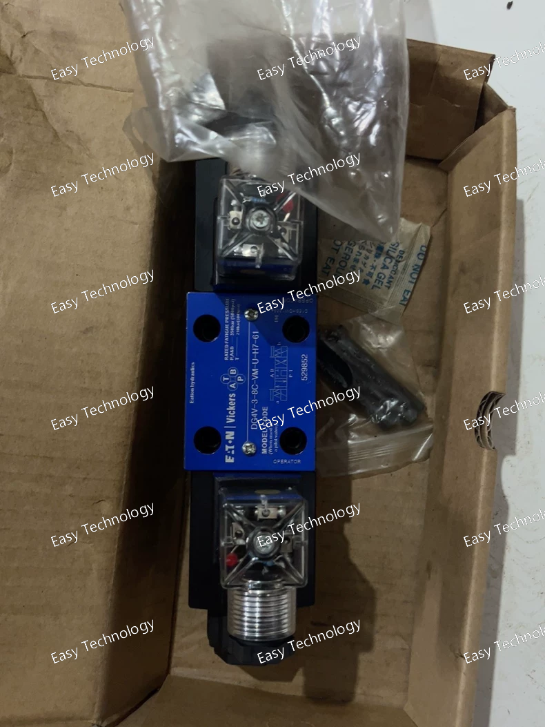 Technical Specifications Brand / Series: Vickers by Eaton — DG4V‑3 series Model Code: DG4V‑3‑2A Valve Type: Solenoid-operated directional control valve (4-way / 3-way depending on spool/port configuration) Mounting / Interface: Subplate / manifold mount — ISO 4401‑03 (D03 / NG06) Actuation: Solenoid operated Electrical Connection: ISO 4400 (DIN 43650) connector Coil Voltage: 24 V DC Maximum Flow Rate: Up to 21 US gpm (≈ 80 L/min) Maximum Operating Pressure (P, A, B ports): 350 bar (≈ 5000 psi) Tank Port Pressure (T port): 210 bar (≈ 3000 psi) Seal Material (standard): Viton Fluid Compatibility: Petroleum-based hydraulic oils Fluid Cleanliness Requirement: ISO 19/17/14 recommended Spool Type / Center Condition: Spool “2A”, spring-centered or spring-offset depending on configuration Stage: Single-stage directional valve Manual Override: Plain (manual override at solenoid ends) Operating Temperature Range: –20 °C to +70 °C (–4 °F to +158 °F) Valve Body Material: Cast gray iron