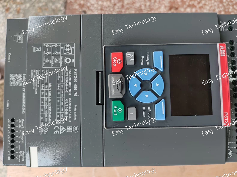 Parameters: Rated Voltage: 380-690 V AC (Three-phase) Rated Current: 600 A Motor Power: Up to 1050 kW at 690 V Up to 750 kW at 400 V Input Control Voltage: 24 V DC (external supply) Output Frequency: 0 to 500 Hz Cooling: Forced air cooling (with fan) Protection Class: IP00 (standard) Ambient Temperature Range: -10°C to +50°C (with derating above 40°C) Overload Capacity: 150% of rated current for 60 seconds 110% of rated current for 1 minute Dimensions (H x W x D): Approx. 1,020 x 740 x 500 mm Weight: Approx. 115 kg (depends on configuration) Degree of Protection: IP20 (for indoor use, optional higher protection classes available with kits) Mounting: Wall-mountable Control Method: Soft start with adjustable ramp-up and ramp-down, with full motor protection features. Key Features: Smooth Motor Start/Stop: The PSTX1050-600-70 ensures a smooth motor start, reducing mechanical shock and inrush current, which extends motor and system life. Advanced Protection Features: Overload protection Phase loss and phase imbalance protection Motor and system diagnostics Overvoltage and undervoltage protection Ground fault protection (depending on configuration) Short-circuit protection
