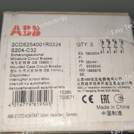 Key Technical Parameters General & Electrical Ratings Product / Model: ABB S204‑C32 4‑Pole Miniature Circuit Breaker Rated Current (In): 32 A Number of Poles: 4 (three phases + neutral) Tripping Characteristic: Type C (moderate inrush tolerance) Rated Operational Voltage: up to 400 V AC (IEC 60898‑1) up to 440 V AC (IEC 60947‑2) Rated Insulation Voltage (Ui): 440 V Rated Frequency: 50 Hz / 60 Hz Standards Compliance: IEC/EN 60898‑1, IEC/EN 60947‑2, UL 1077, CSA 22.2 Degree of Protection: IP20 housing Operational Ambient Temperature: –25 °C to +55 °C Pollution Degree: 3 Short‑Circuit & Breaking Capacities Rated Ultimate Short‑Circuit Breaking Capacity (Icu): 20 kA at 230 V AC 10 kA at 400 V AC Rated Service Short‑Circuit Breaking Capacity (Ics): 15 kA at 230 V AC 7.5 kA at 400 V AC Rated Short‑Circuit Capacity (Icn): 6 kA at 400 V AC Rated Impulse Withstand Voltage (Uimp): 4 kV Dielectric Test Voltage: 2 kV (50/60 Hz, 1 min) Energy Limiting Class: 3 Mechanical & Installation Mounting Type: DIN‑rail (TH35) Terminal Type: Screw terminals (failsafe bi‑directional) Tightening Torque: ~2.8 N·m Wire Stripping Length: 12.5 mm Mechanical Endurance: ~20,000 cycles Electrical Endurance: ~10,000 AC cycles Actuator: Toggle with ON/OFF indication Physical Housing Width: 4 modular units Dimensions (approx): Width ~70 mm × Height ~88 mm × Depth ~69 mm Contact Position Indication: Red (ON) / Green (OFF) Connectable Conductor Sizes: Solid: 0.75 – 35 mm² Stranded: 0.75 – 25 mm² Applications Overload and short‑circuit protection in three‑phase power distribution circuits Protection of branch circuits in commercial and industrial panelboards Suitable for moderate inrush loads (lighting, small motors) Compatible with accessory modules like auxiliary contacts, shunt trips, alarm switches