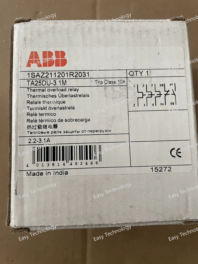 Technical Parameters Parameter Specification Product type Thermal overload relay Product series ABB TA series ABB Ordering Code 1SAZ211201R2031 Compatible contactors ABB A / AF series contactors Current setting range 3.1 A Tripping class Class 10A Number of poles 3 Rated operational voltage (Ue) Up to 690 V AC Rated insulation voltage (Ui) 690 V AC Auxiliary contacts 1 NO + 1 NC (trip indication) Reset type Manual Phase failure sensitivity Yes Ambient temperature compensation Yes Mounting Direct mounting to contactor or panel mounting Protection degree IP20 Ambient operating temperature −25 °C to +55 °C Applicable standards IEC compliant Typical applications Small motor starters, control panels, industrial motor protection