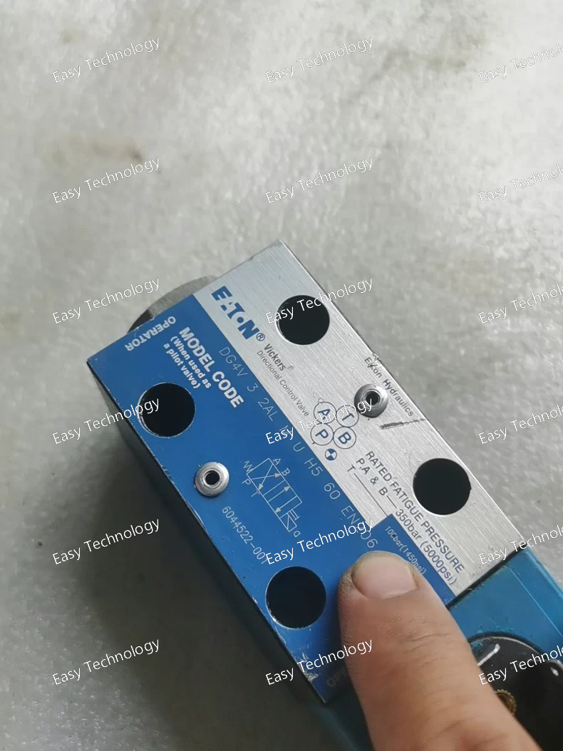 Parameter Specification Manufacturer / Series Eaton / DG4V-3 Part Number / Model DG4V-3-2A-M-U-H7-60 Valve Type Solenoid Operated, Directional Control Valve Configuration 4-Port, 3-Position (4/3) Actuation Type Single Solenoid, Spring Offset Spool Type 2A (Defines the internal flow path geometry in the actuated position) Middle Position Closed Center (M) - In center position: All ports (P, T, A, B) are blocked. Mounting Style Subplate Mounting (ISO 4401-03 / CETOP 3 interface) Electrical Connection DIN 43650 Form A (with LED indicator and manual override) Coil Voltage -H7- typically denotes a 24V DC coil. Always confirm with supplier or datasheet. Protection Class IP65 (Dust tight and protected against water jets) Performance Nominal Flow Rate 60 L/min (15.8 US GPM) Maximum Operating Pressure 350 bar (5,000 psi) Solenoid Characteristics Solenoid Type Wet Pin DC Duty Cycle Continuous (Class F insulation system) Hydraulic Fluid Mineral oil-based hydraulic fluids to ISO 11158 (e.g., HV46) Fluid Temperature Range -30 °C to +80 °C (-22 °F to +176 °F) Fluid Viscosity Range 10 to 500 cSt (50 SSU to 2300 SSU) Filtration Level Recommended: 25 µm absolute or better, per ISO 4406 code 18/16/13 Weight (Approx.) ~2.0 kg (4.4 lbs) - (varies with coil and options)
