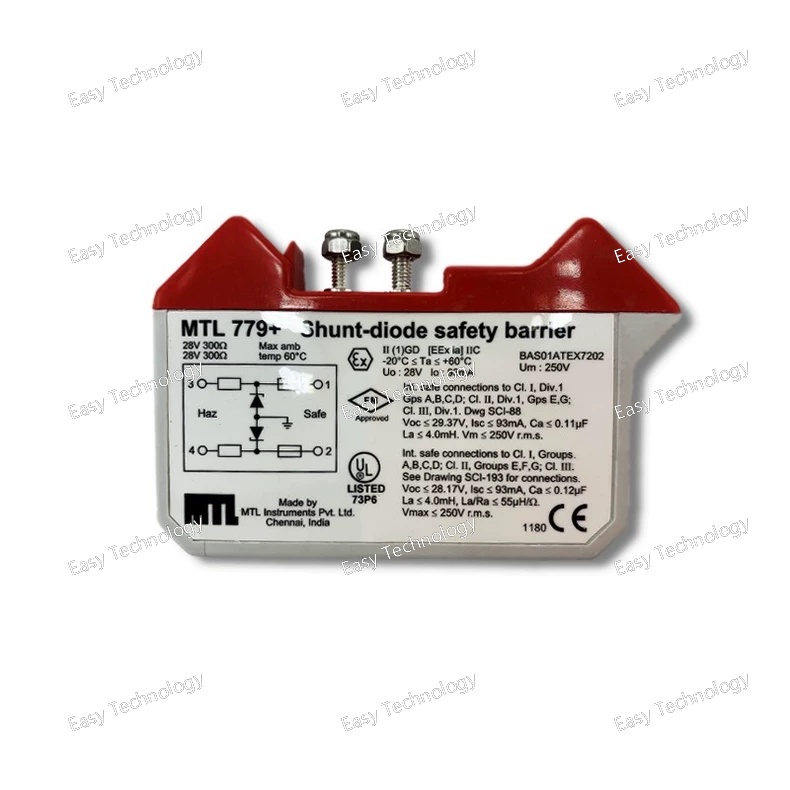 Parameter Specification Product Model MTL-779+ Product Line Eaton MTL Signal Conditioners & Isolators Function 2-Wire Transmitter Isolator & Power Supply Input Signal Accepts and powers a 2-wire, 4-20 mA transmitter from a hazardous area. Output Signal 4-20 mA DC (Isolated) Input/Output Isolation Galvanic Isolation between input, output, and power supply. Power Supply Typically 20-30 V DC (for standard models) Intrinsic Safety (IS) Approval Yes. Certified for use in Hazardous Areas (e.g., ATEX, IECEx). Entity Parameters (Example values, MUST be verified for design): - Vmax (Ui): e.g., 28 V - Imax (Ii): e.g., 93 mA - Pi: e.g., 0.65 W - Ci: e.g., 0 μF - Li: e.g., 0 mH Non-Incendive (NI) Approval Yes (for applicable standards like FM/CSA). Line Fault Detection Yes, can detect open and short circuits in the field wiring. Accuracy Typically better than ±0.1% of span. Mounting DIN-Rail Mount (Standard 35 mm) Operating Temperature -20°C to +60°C Compliance & Certifications ATEX, IECEx, FM, CSA, NEPSI, etc. (Specific certifications depend on the product suffix).