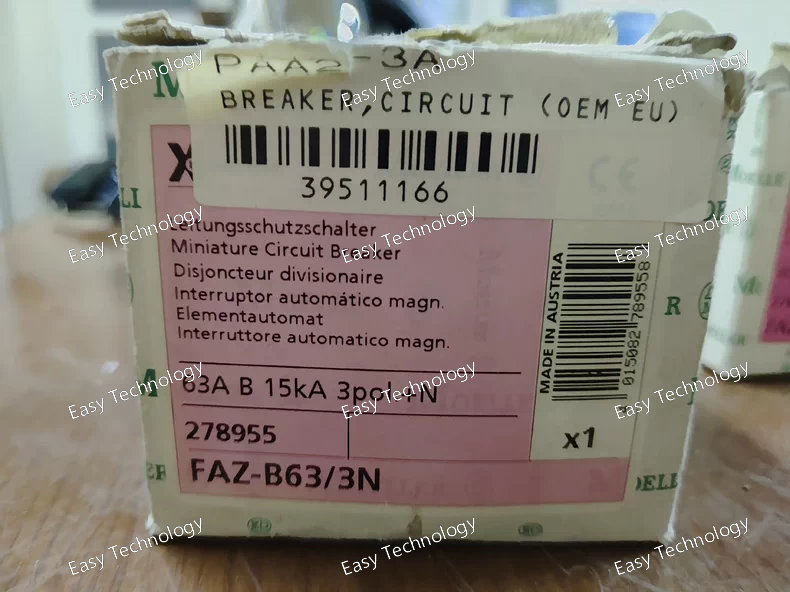 Parameter Specification Product Model FAZ-B63/3N Product Line Eaton FAZ B-Series (Miniature Circuit Breaker) Number of Poles 3 Poles + Neutral (3P+N) Rated Current (In) 63 A Tripping Characteristic B-Curve (Instantaneous tripping between 3 to 5 times rated current). Suitable for resistive and low inductive loads. Rated Operational Voltage (Ue) 230/400 V AC Rated Insulation Voltage (Ui) 500 V AC Rated Impulse Withstanding Voltage (Uimp) 4 kV Rated Breaking Capacity (Icn) Typically 10 kA at 230/400V AC according to IEC 60898-1. (Please confirm with local catalog as higher capacity versions may exist). Standards IEC/EN 60898-1, IEC/EN 60947-2 Terminal Connection Suitable for cables up to 35 mm² (copper). Mounting Standard DIN Rail (35 mm) mounting. Mechanical Life Typically > 20,000 cycles Electrical Life Typically > 10,000 cycles Torque Screw Typically 3.0 N·m