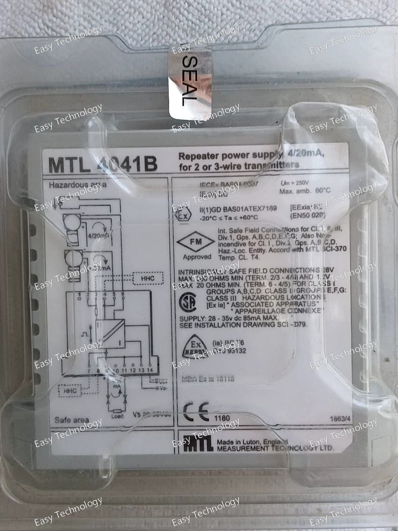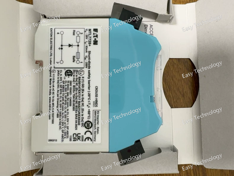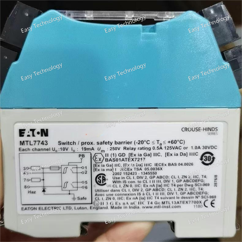 Parameter Specification Product Model MTL7782+ Product Line Eaton MTL Signal Conditioners & Isolators Function Dual-channel, 2-Wire Transmitter Isolator & Power Supply Input Signal Accepts and powers two independent 2-wire, 4-20 mA transmitters from a hazardous area. Output Signal Two independent, isolated 4-20 mA DC signals. Input/Output Isolation Galvanic Isolation between input, output, and power supply. Power Supply Typically 20-30 V DC Intrinsic Safety (IS) Approval Yes. Certified for use in Hazardous Areas (e.g., ATEX, IECEx). Entity Parameters (Example values, MUST be verified for design): - Vmax (Ui): e.g., 28 V - Imax (Ii): e.g., 93 mA - Pi: e.g., 0.65 W - Ci: e.g., 0 μF - Li: e.g., 0 mH Non-Incendive (NI) Approval Yes (for applicable standards like FM/CSA). Line Fault Detection Yes, can detect open and short circuits in the field wiring. Accuracy Typically better than ±0.1% of span. Mounting DIN-Rail Mount (Standard 35 mm) Operating Temperature -20°C to +60°C
