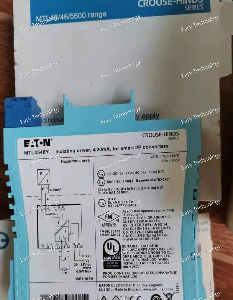 Parameter Specification Product Model MTL4546Y Product Line Eaton MTL4500+ Series Signal Conditioners & Isolators Function Single-channel, 2-Wire Transmitter Isolator & Power Supply Input Signal Accepts and powers a 2-wire, 4-20 mA transmitter from a hazardous area. Output Signal Isolated Voltage Output (e.g., 0-10 V DC or other programmable range, MUST be verified from datasheet). Input/Output/Power Isolation Galvanic Isolation (Typically 1.5 kV AC or higher) Power Supply Typically 20-30 V DC Intrinsic Safety (IS) Approval Yes. Certified for use in Hazardous Areas (e.g., ATEX, IECEx). Entity Parameters (MUST be verified from datasheet): - Vmax (Ui): e.g., 28 V - Imax (Ii): e.g., 93 mA - Pi: e.g., 0.65 W - Ci: e.g., 0 μF - Li: e.g., 0 mH Non-Incendive (NI) Approval Yes (for applicable standards like FM/CSA). Line Fault Detection Yes, can detect open and short circuits in the field wiring. Accuracy Typically better than ±0.1% of span. Mounting DIN-Rail Mount (Standard 35 mm) Operating Temperature -20°C to +60°C Compliance & Certifications ATEX, IECEx, FM, CSA, etc.