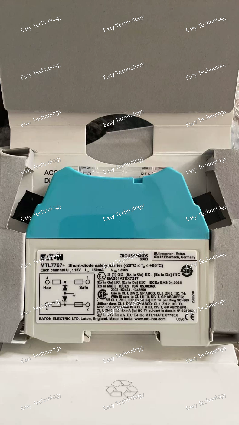 Parameter Specification Product Model MTL7767+ Product Line Eaton MTL Signal Conditioners & Isolators Function Dual-channel, 2-Wire Transmitter Isolator & Power Supply Input Signal Accepts and powers two independent 2-wire, 4-20 mA transmitters from a hazardous area. Output Signal Two independent, isolated 4-20 mA DC signals. Input/Output Isolation Galvanic Isolation between input, output, and power supply. Power Supply Typically 20-30 V DC Intrinsic Safety (IS) Approval Yes. Certified for use in Hazardous Areas (e.g., ATEX, IECEx). Entity Parameters (Example values, MUST be verified for design): - Vmax (Ui): e.g., 28 V - Imax (Ii): e.g., 93 mA - Pi: e.g., 0.65 W - Ci: e.g., 0 μF - Li: e.g., 0 mH Non-Incendive (NI) Approval Yes (for applicable standards like FM/CSA). Line Fault Detection Yes, can detect open and short circuits in the field wiring. Accuracy Typically better than ±0.1% of span. Mounting DIN-Rail Mount (Standard 35 mm) Operating Temperature -20°C to +60°C