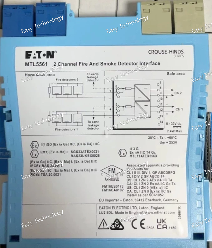 Parameter Specification Product Model MTL5561 Product Line Eaton MTL5500+ Series Signal Conditioners & Isolators Function Dual-channel, 2-Wire Transmitter Isolator & Power Supply Input Signal Accepts and powers two independent 2-wire, 4-20 mA transmitters from a hazardous area. Output Signal Two independent, isolated 4-20 mA DC signals. Input/Output/Power Isolation Galvanic Isolation (Typically 1.5 kV AC or higher) Power Supply Typically 20-30 V DC Intrinsic Safety (IS) Approval Yes. Certified for use in Hazardous Areas (e.g., ATEX, IECEx). Entity Parameters (MUST be verified from datasheet): - Vmax (Ui): e.g., 28 V - Imax (Ii): e.g., 93 mA - Pi: e.g., 0.65 W - Ci: e.g., 0 μF - Li: e.g., 0 mH Non-Incendive (NI) Approval Yes (for applicable standards like FM/CSA). Line Fault Detection Yes, can detect open and short circuits in the field wiring. Accuracy Typically better than ±0.1% of span. Mounting DIN-Rail Mount (Standard 35 mm) Operating Temperature -20°C to +60°C Compliance & Certifications ATEX, IECEx, FM, CSA, etc.