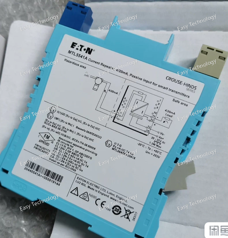 Parameter Specification Product Model MTL5541A Product Line Eaton MTL5500+ Series Signal Conditioners & Isolators Function Single-channel, 2-Wire Transmitter Isolator & Power Supply Input Signal Accepts and powers a 2-wire, 4-20 mA transmitter from a hazardous area. Output Signal Isolated 4-20 mA DC signal. Input/Output/Power Isolation Galvanic Isolation (Typically 1.5 kV AC or higher) Power Supply Typically 20-30 V DC Intrinsic Safety (IS) Approval Yes. Certified for use in Hazardous Areas (e.g., ATEX, IECEx). Entity Parameters (MUST be verified from datasheet): - Vmax (Ui): e.g., 28 V - Imax (Ii): e.g., 93 mA - Pi: e.g., 0.65 W - Ci: e.g., 0 μF - Li: e.g., 0 mH Non-Incendive (NI) Approval Yes (for applicable standards like FM/CSA). Line Fault Detection Yes, with enhanced diagnostics (inferred from "A" suffix). Accuracy Typically better than ±0.1% of span. Mounting DIN-Rail Mount (Standard 35 mm) Operating Temperature -20°C to +60°C Compliance & Certifications ATEX, IECEx, FM, CSA, etc.
