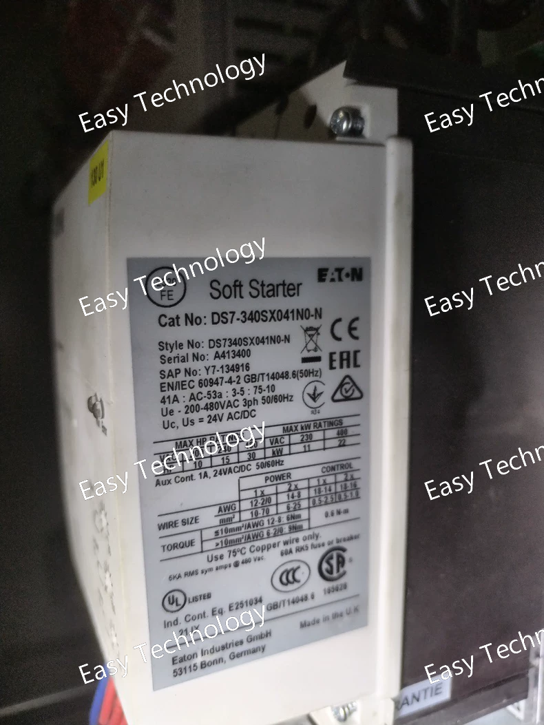 Parameter Specification Product Series Eaton DS7 Model Number DS7-340SX041N0-N Description Soft Starter with Bypass, 340A Frame, 41A, 22kW, 400V Rated Supply Voltage 400V AC, 50/60 Hz (3 Phase) Frame Size 340A Set Current / Max. Current 41 A (Adjustable within the frame's range) Motor Power Rating 22 kW (30 HP) @ 400V Control Supply Voltage 100-250V AC (as set by "SX" code) Integrated Bypass Yes (Internal Bypass Contactor) Keypad Standard Keypad (Not the advanced LCD version) Start Control Voltage ramp, Current limit Protection Features Overload, Phase Loss, Phase Imbalance, Locked Rotor, Overheating Communication Optional communication modules (e.g., Profibus DP, DeviceNet, Modbus RTU) Enclosure Rating IP00 (Open Type, must be installed in a control panel) Standards & Certifications CE, cULus, RoHS